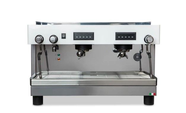 Coffee is dosed with the electromechanical push buttons to start and stop the brewing process.